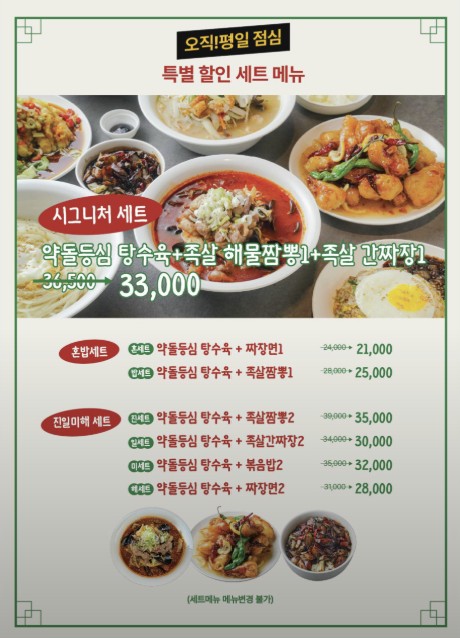 - 가성비 팁 : 2인 기준 족살해물짬뽕 + 족살간짜장에 탕수육(소)을 곁들이면 다양한 메뉴를 합리적으로 맛볼 수 있습니다.